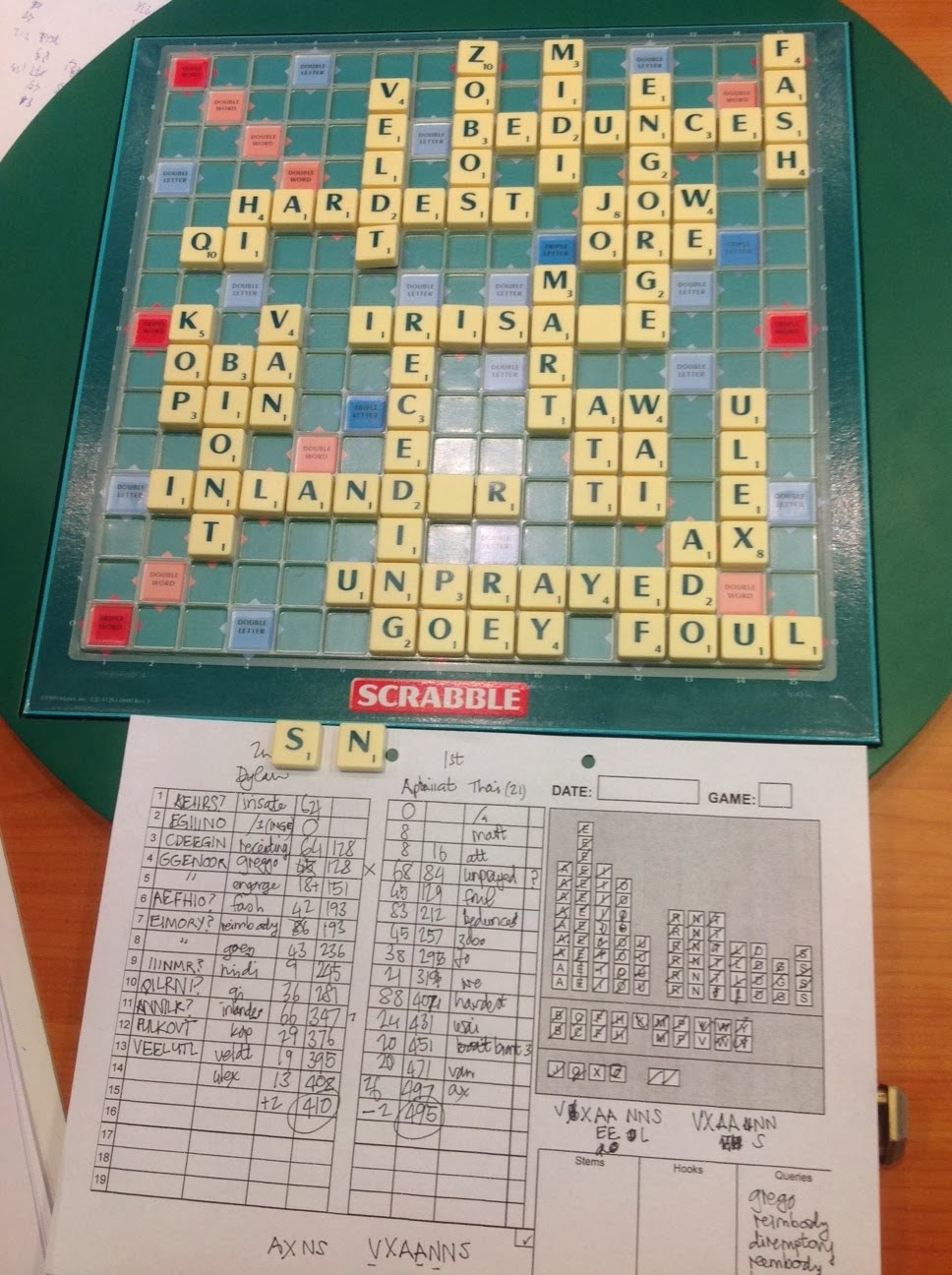 Good win for me. Had only 6 vowels in my first 6 turns. Was trailing by 100. Engineered a good endgame outplay. 2/5 wins. This tourney is killer tough